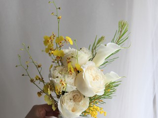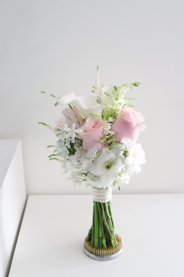 핑크 장미와 화이트 카라를 믹스해 여성스러움을 강조한 부케입니다. 다양한 화이트 꽃 소재와 그린 소재도 넣어 퓨어한 싱그러움까지 더해보았습니다.