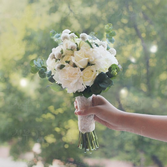 리시안셔스, 사루비아, 유칼립투스 소재의 혼합 부케이며, 4계절 모두 이용이 가능한 부케입니다.천일홍은 포인트로 내추럴한 느낌으로 연출합니다.