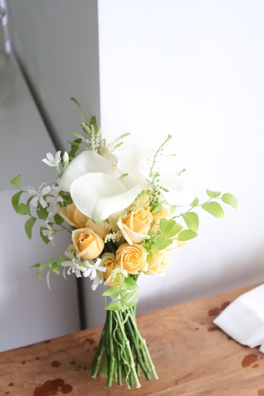 노란 장미 사이로 화이트 카라를 넣어 내추럴한 아름다움을 강조한 부케입니다. 스마일락스 소재도 더해 싱그러움 느낌도 듭니다.