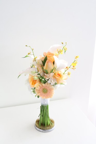 거베라와 카라, 장미 그리고 온시디움을 믹스하여 환하고 상큼한 느낌을 자아내는 부케입니다. 밝은 분위기의 웨딩을 선호하는 신부님께 추천드립니다.