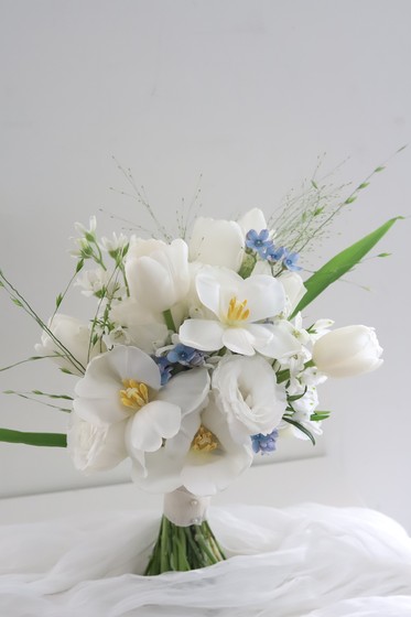 화이트 튤립에 옥시, 스위트피, 델피늄 등 깨끗하고 깔끔한 꽃으로 제작된 부케입니다.