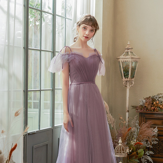 파스텔톤의 바이올렛 도트무늬가 돋보이는 튤 소재의 발목기장감의 롱드레스입니다.