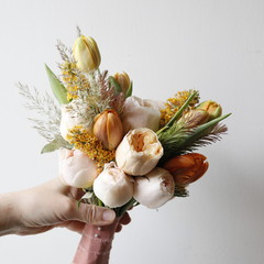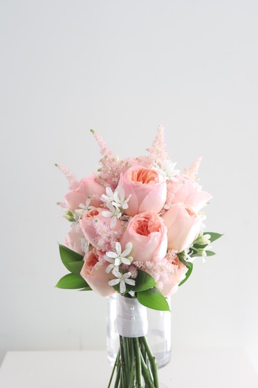 줄리엣 장미를 메인으로 잡은 부케입니다. 고급스러운 화형의 장미로 어느 각도에서 보아도 예쁩니다.