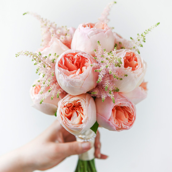 화이트 드레스에 가장 잘 어울리는 피치톤을 사랑스러운 부케입니다. 고급스러운 줄리엣 로즈와 아스틸베 믹스 스페셜 오더메이드!